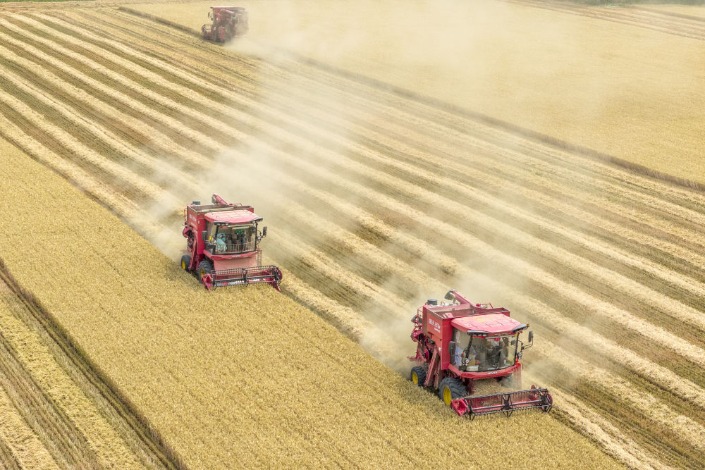 2025年6月9日,河南省三門峽靈寶市西閻鄉(xiāng)東古驛村村民在搶收小麥(無人機照片)。新華社發(fā)(杜杰 攝)